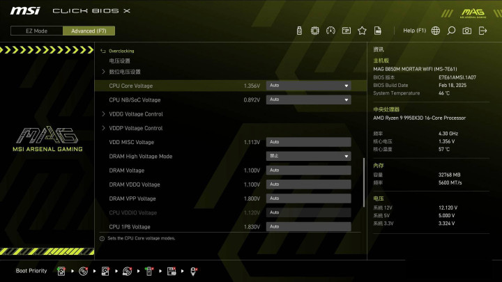 BIOS界面作为用户与硬件交互的重要窗口,在微星B850M迫击炮主板上得到了精心设计。全新的BIOS页面采用了直观易懂的黑绿配色方案,EZ模式下集成了诸如一键开启PBO模式、EXPO内存设置等功能,即便是新手也能轻松完成基本设置。而对于高级用户而言,F7键可快速切换至高级模式,提供更为细致的超频调节选项。这些特性不仅提升了用户的操作便利性,也体现了微星对用户体验细节的关注。