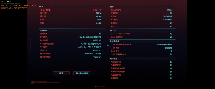 在《黑神话:悟空》3.5K分辨率高画质下,这套系统能够稳定运行在206FPS左右,1% Low帧率表现优异。在《赛博朋克2077》3.5K分辨率光追模式下,帧率稳定在382FPS,都开启了DLSS 4X,非常流畅。